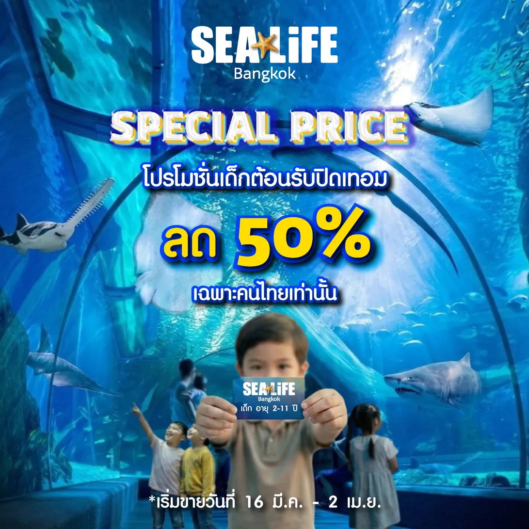 ต้อนรับช่วงปิดเทอม ชวนเด็กๆ มาร่วมผจญภัยใต้ท้องทะเลที่ SEA LIFE Bangkok พบกับสัตว์ทะเลหลากหลายสายพันธุ์ พร้อมกิจกรรมและโซนจัดแสดงที่น่าตื่นตาตื่นใจ ดื่มด่ำกับโลกใต้ทะเลลึก และสร้างความทรงจำแสนพิเศษกับครอบครัว ในราคาสุดคุ้ม บัตรเข้าชมสำหรับเด็ก ลด 50% (บัตรเข้าชมสำหรับเด็ก อายุ 2-11 ปีเท่านั้น)