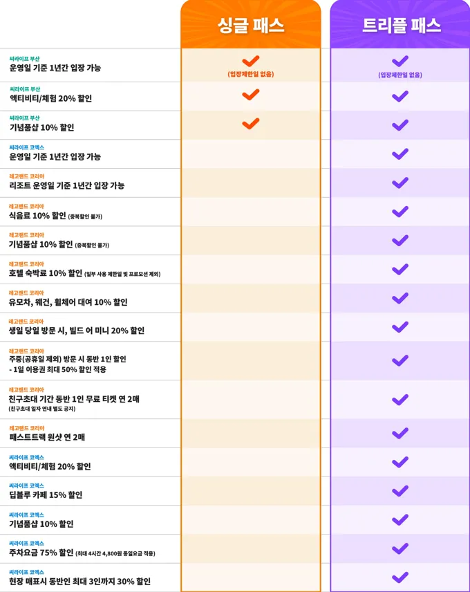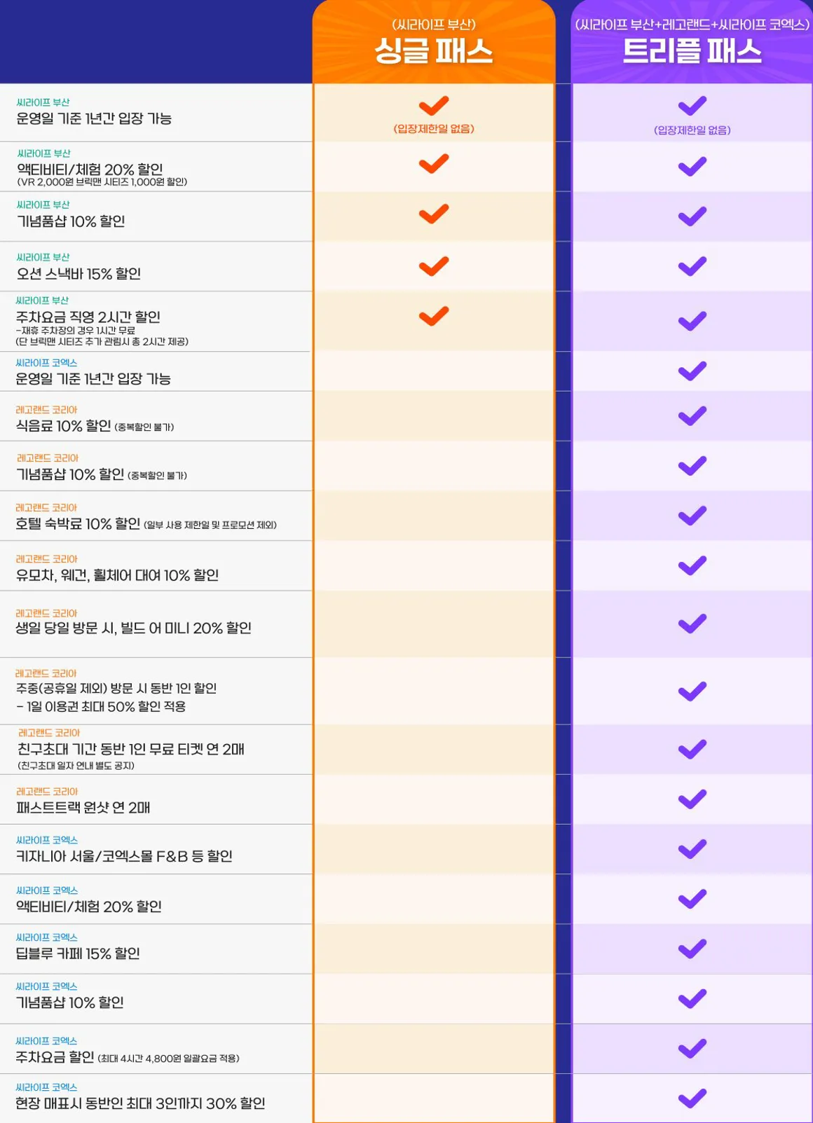 - LEGOLAND 코리아/씨라이프 코엑스/씨라이프 부산 입장 제한일 없이 1년 이용 가능