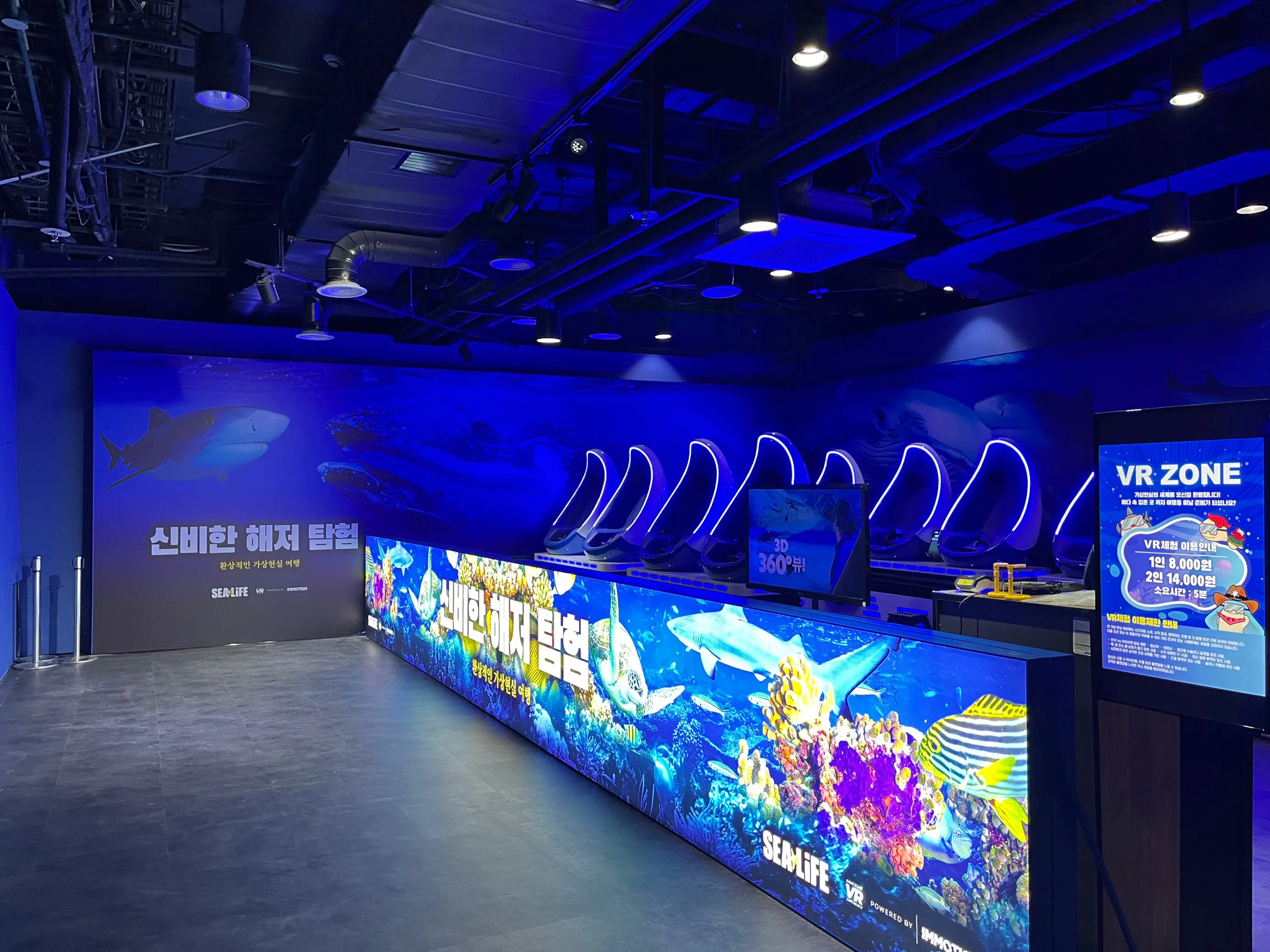 4K 영상 헬멧을 착용하고 눈과 귀와 모션을 통해 바닷속 세계에 빠져 볼 준비가 되셨나요? 우리가 가보지 못했던 바닷속 세계는 상어, 혹등고래, 만타가오리, 등을 만나 볼 수 있습니다.