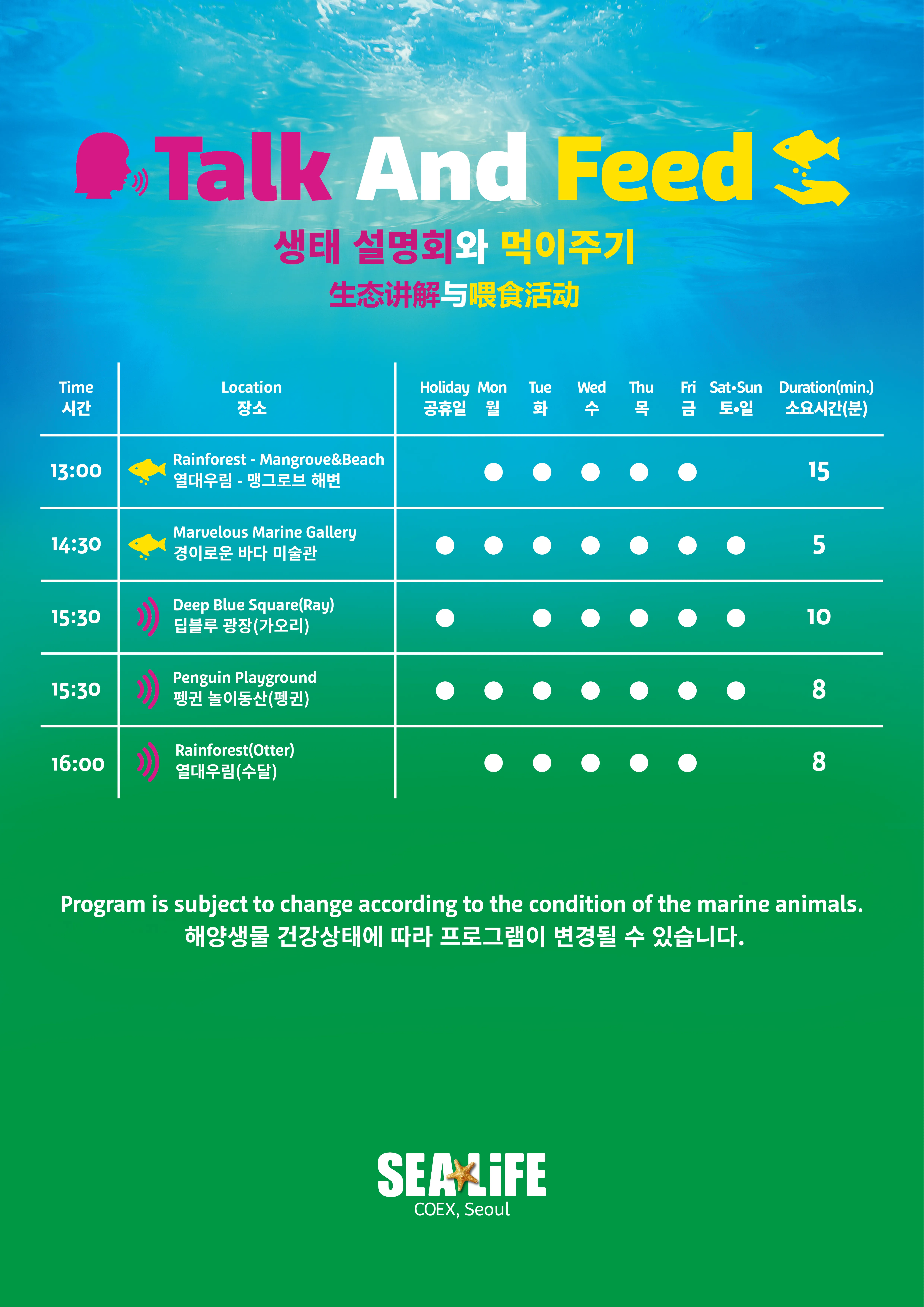 씨라이프 코엑스 아쿠아리움을 방문하기 전 미리 공연 정보를 체크하고 모든 프로그램을 즐겨보세요!