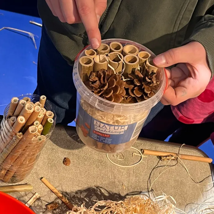 Um auch der Umwelt etwas zurück zu geben, haben sich das Team diesmal dazu entschlossen ihre ganz eigenen Insektenhäuser zu bauen. Die Bestände der heimischen Insekten zeigen Rückgänge von bis zu 80%. Grund dafür sind die Verschlechterung des Lebensraums, Pestizidbehandlungen sowie Lichtverschmutzung. Mit ihren Insektenhäusern helfen die Tierforscher*innen dabei einen sicheren Rückzugsport zu finden, der in der Natur immer rarer wird. Insekten zu schützen ist wichtig, denn die Tiere sind nicht nur ein wichtiger Bestandteil der Nahrungskette, sondern tragen auch zur Bestäubung von Pflanzen und damit der Erhaltung von Wildblumen bei. Zudem sind auch Obst und Gemüseplantagen auf sie angewiesen. Zum Schluss gab es dann noch ein Gruppenbild mit allen neu erbauten Insektenverstecken.