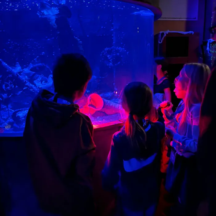 Zum Ende des Jahres wurde es dann sogar noch etwas unheimlich. Nur mit roten Taschenlampen ausgestattet ging es für die jungen Tierforscher*innen ab in die nächtliche Unterwasserwelt des SEA LIFE Oberhausen. Wenn alle Besucher*innen aus dem Haus und die Lichter im Aquarium aus sind, kann man die Bewohner noch einmal aus einem ganz neuen Blickwinkel kennenlernen. Besonders beeindruckend ist es die Haie dabei zu beobachten wie sie ihre Runden durch das dunkle Ozeanbecken ziehen. Doch einfach nur eine gemütliche Wanderung ist für unser Tierforscherteam natürlich noch nicht genug. Es ging nämlich gleichzeitig noch auf Schatzsuche. Nach einer kniffeligen Schnitzeljagd, gab es schließlich als Belohnung eine große Truhe voll mit spuktastischen Schätzen.