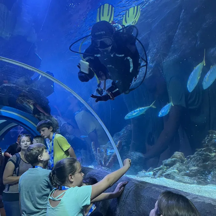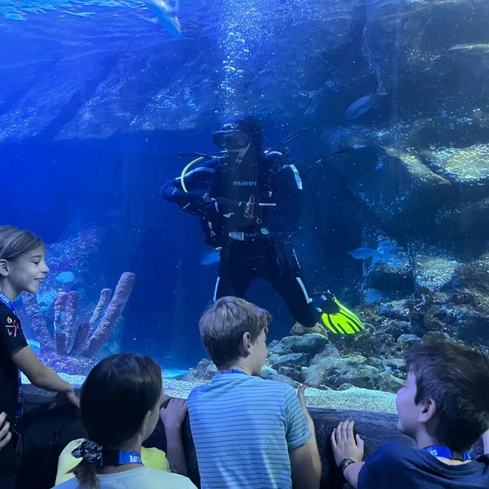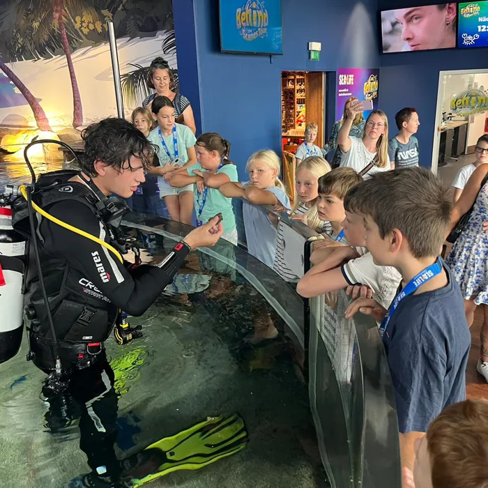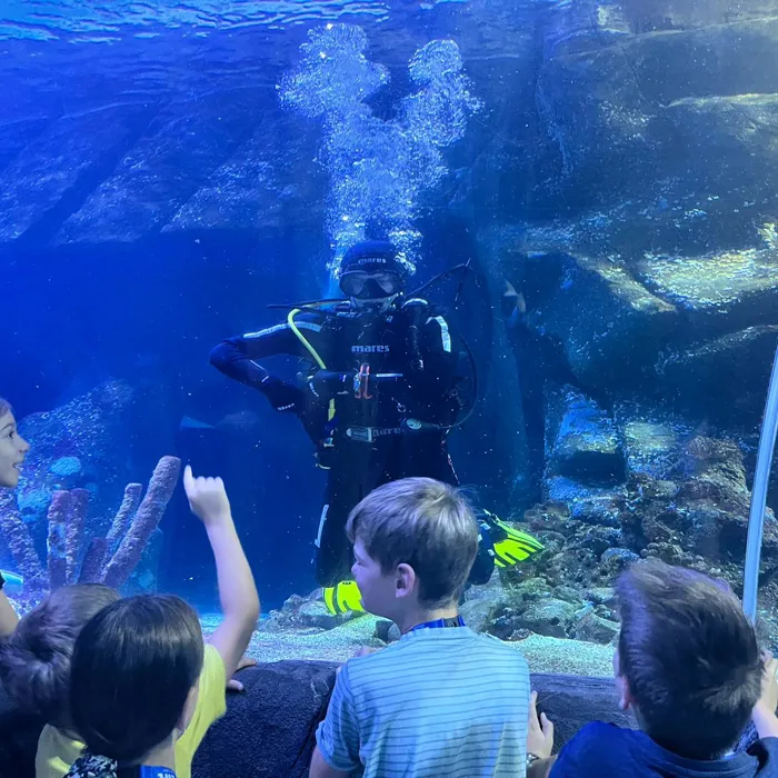Gemeinsam mit Haitaucher Max drehte sich dieses Mal alles um das Thema Tauchen. So konnten unsere Tierforscher*innen das besondere Tauchequipment ganz genau unter die Lupe nehmen. Wie funktioniert eigentlich Atemregel, was muss man beim Abtauchen beachten und wie kommunizieren Taucher unter Wasser ohne zu sprechen? All das konnten die Kinder am praktischen Beispiel erfahren. Das neu gelernte wurde dann auch direkt im Ozeantunnel getestet. So zeigten die Tierforscher*innen Taucher Max zum Beispiel per Handzeichen, wenn sich einer der Haie näherte.