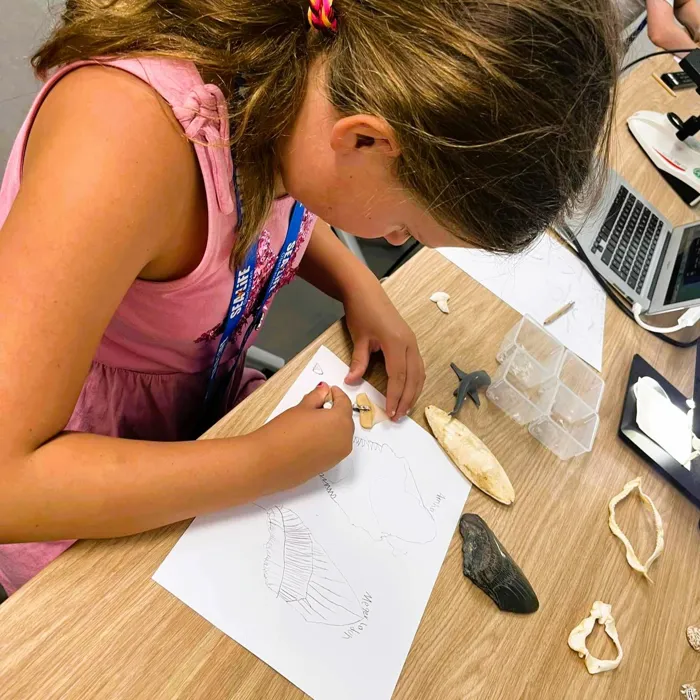 Jedes Jahr am 14.Juli findet der internationale Shark Awareness Day statt. Dieser besondere Tag soll dazu dienen, über Haie und ihre Bedrohung aufzuklären und die Wichtigkeit der faszinierenden Räuber für die Weltmeere zu verdeutlichen. Natürlich haben sich auch unserer jungen Tierforscher*innen an diesem Tag ausführlich mit Haien beschäftigt. So wurden unterschiedliche Haigebisse und Haieier untersucht und vielen spannenden Geschichten von unserem Haitaucher gelauscht. Zum Abschluss gab es dann für alle die dabei waren noch ein paar Schwarzspitzen-Riffhai-Zähne mit. Da Haie über ein sogenanntes Revolvergebiss verfügen, bei dem mehrere Zahnreihen hinter einander stehen, tauschen sie ihr Zähne nämlich regelmäßig aus. So können unsere Taucher sie am Beckengrund einsammeln und unter die Lupe nehmen.