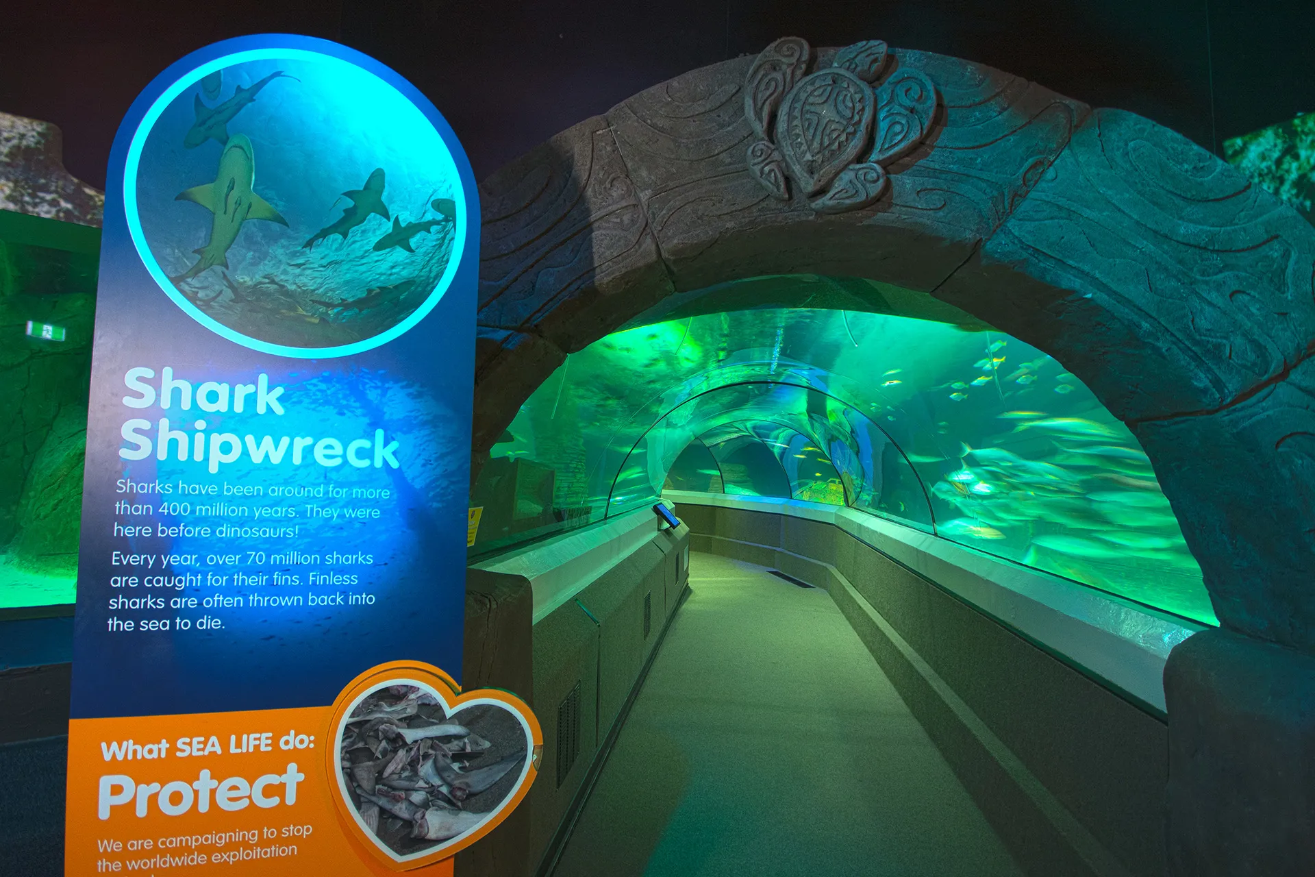 Explore the depths of the ocean as you walk beneath our 80 meter long Ocean Tunnel. View sharks, rays, reef fish and much more! Soak in the amazing sea view and discover the three different and unique zones. Take in the collection of coloured fish in Coral Cove, encounter eight species of sharks in Shark Shipwreck and meet a variety of marine life in Bay of Rays.