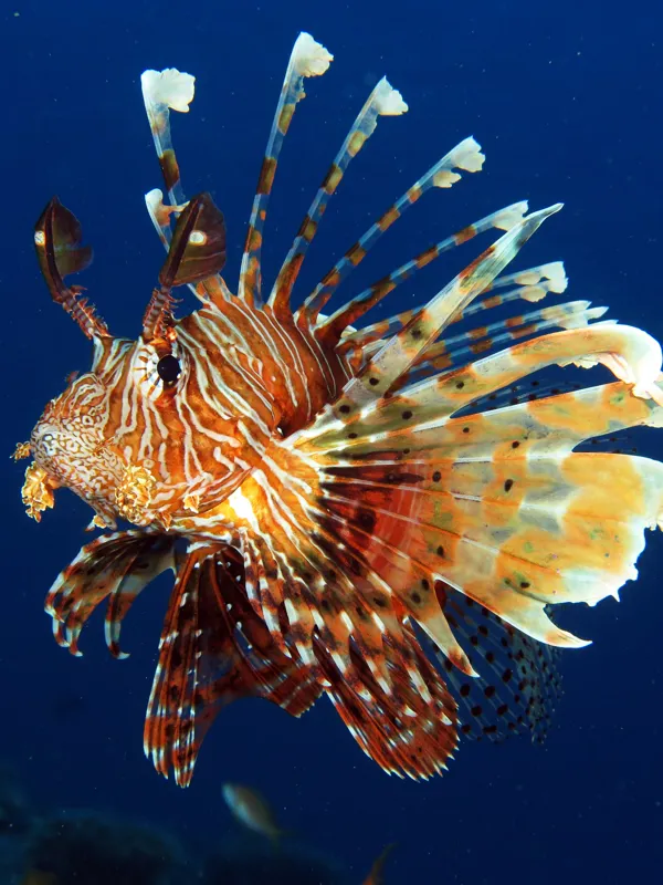 FeuerfischDen Feuerfisch mit seinen fächerförmigen Brustflossen und Strahlen könnt ihr nicht übersehen. -